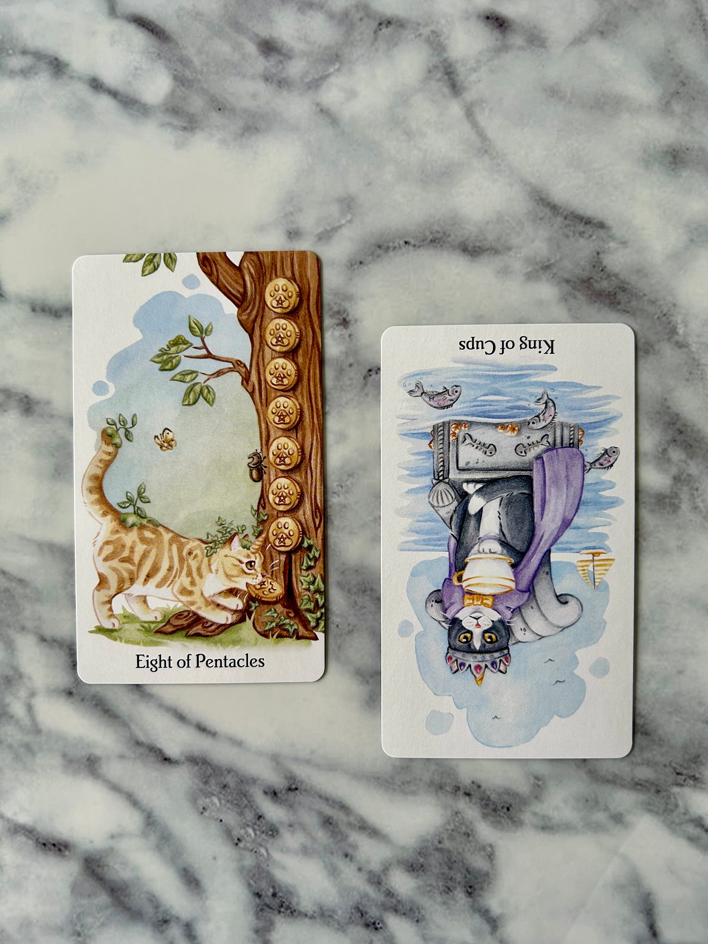 I picked a deck in my collection that makes me particularly happy every time I use it. It always knows how to bring a smile to my face. That is Caticorn Tarot by Pamela Chen and illustrated by Delphine Dion. It’s published by US Games.